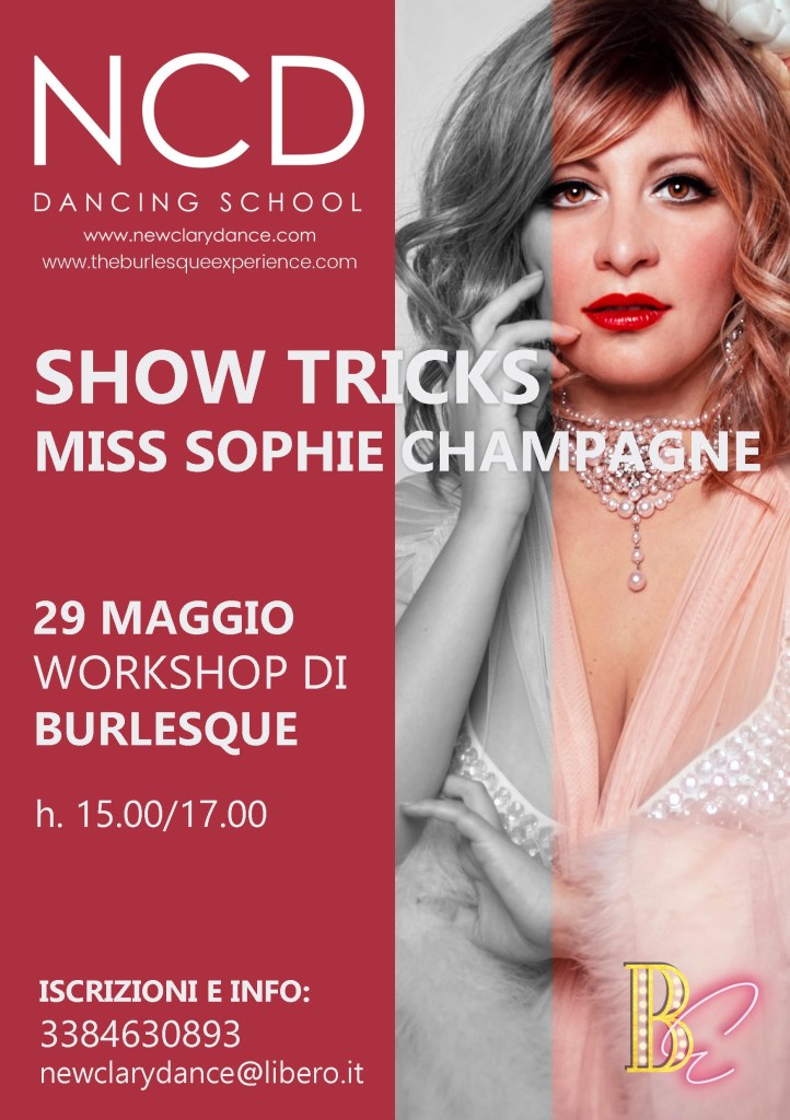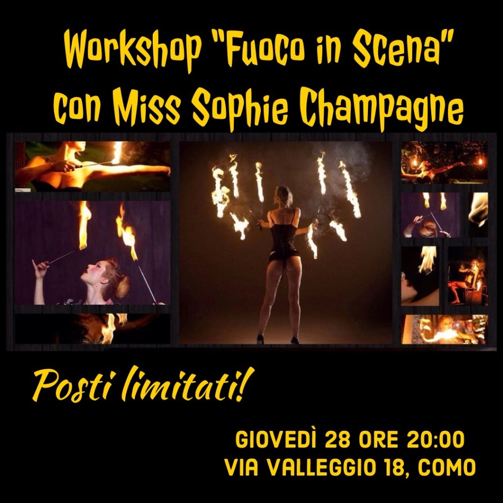 In questo workshop di 3 ore, che si terrá a Como giovedì 28 Aprile dalle 20 alle 23, Miss Sophie Champagne vi insegnerá ad avvicinarvi all’arte del fuoco, superando la paura iniziale, le tecniche per usare in sicurezza il fuoco in scena, presenteremo i principali attrezzi come le bacchette di fuoco, le fire hands, i ventagli di fuoco e infine parleremo del modo migliore di inserire l’elemento del fuoco nel nostro show.