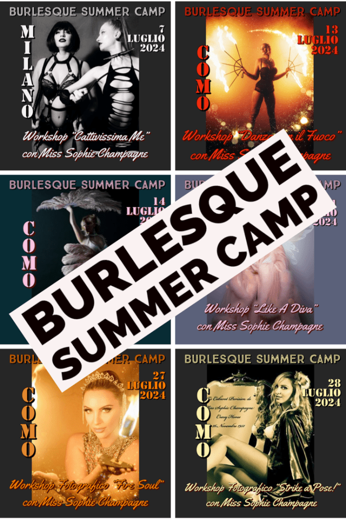 Come lo scorso anno ritorna a Luglio l’appuntamento con il Burlesque Summer Camp di Miss Sophie Champagne: 6 incontri acquistabili singolarmente o in pacchetti scontati per imparare e approfondire l’arte del burlesque, delle performance con il fuoco, e per realizzare dei bellissimi scatti nei nostri workshop fotografici.