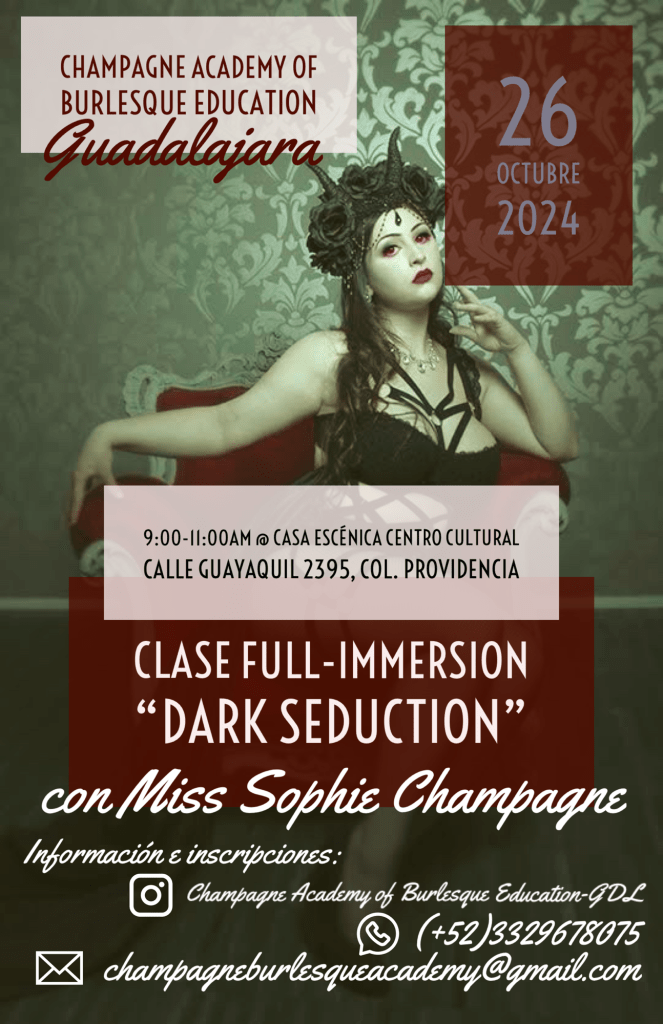 ¡Prepárate para una experiencia inolvidable! Llega a Guadalajara el taller más seductor del año: “Dark Seduction”. Este próximo sábado 26 de octubre en Casa Escénica, serás parte de un evento exclusivo que te permitirá explorar tu lado más enigmático y sensual, de la mano de Miss Sophie Champagne, la reconocida performer internacional y directora de la Champagne Academy of Burlesque Education.